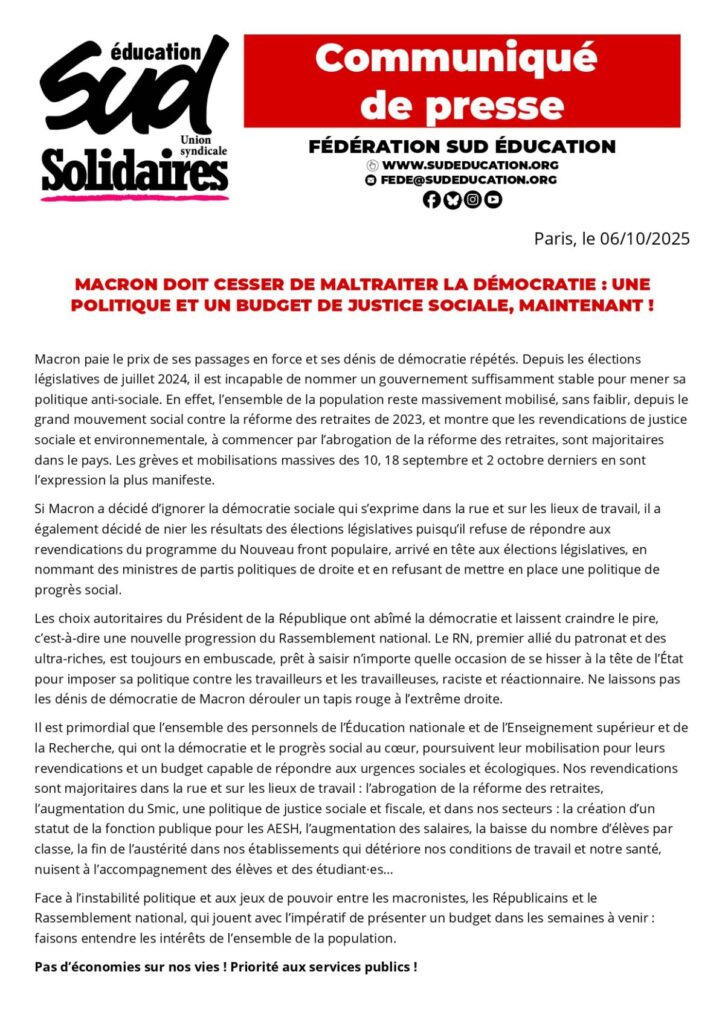 Macron paie le prix de ses passages en force et ses dénis de démocratie répétés. Depuis les élections législatives de juillet 2024, il est incapable de nommer un gouvernement suffisamment stable pour mener sa politique anti-sociale. En effet, l’ensemble de la population reste massivement mobilisé, sans (...)